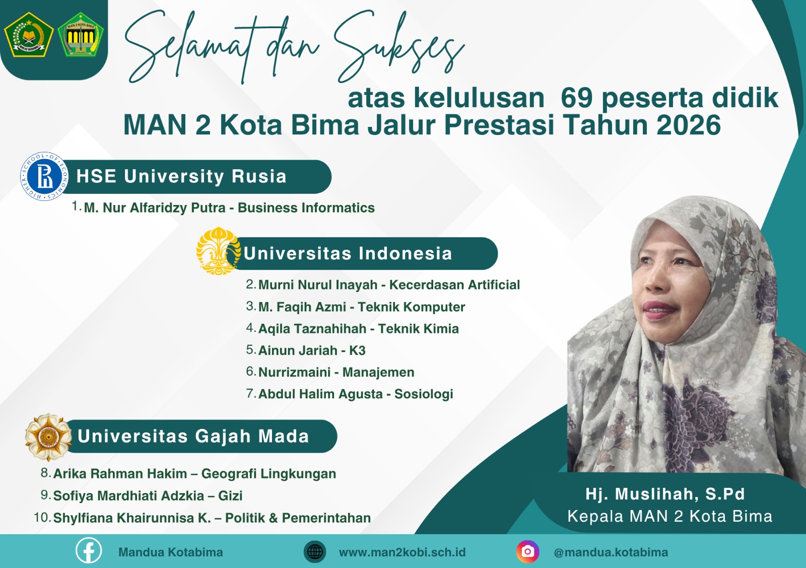 _Luar biasa! MAN 2 Kota Bima kembali mencetak prestasi membanggakan. Sebanyak 69 peserta didik dinyatakan lolos SNBP 2026 dan diterima di berbagai perguruan tinggi favorit nasional hingga internasional, membuktikan kualitas madrasah yang semakin mendunia._